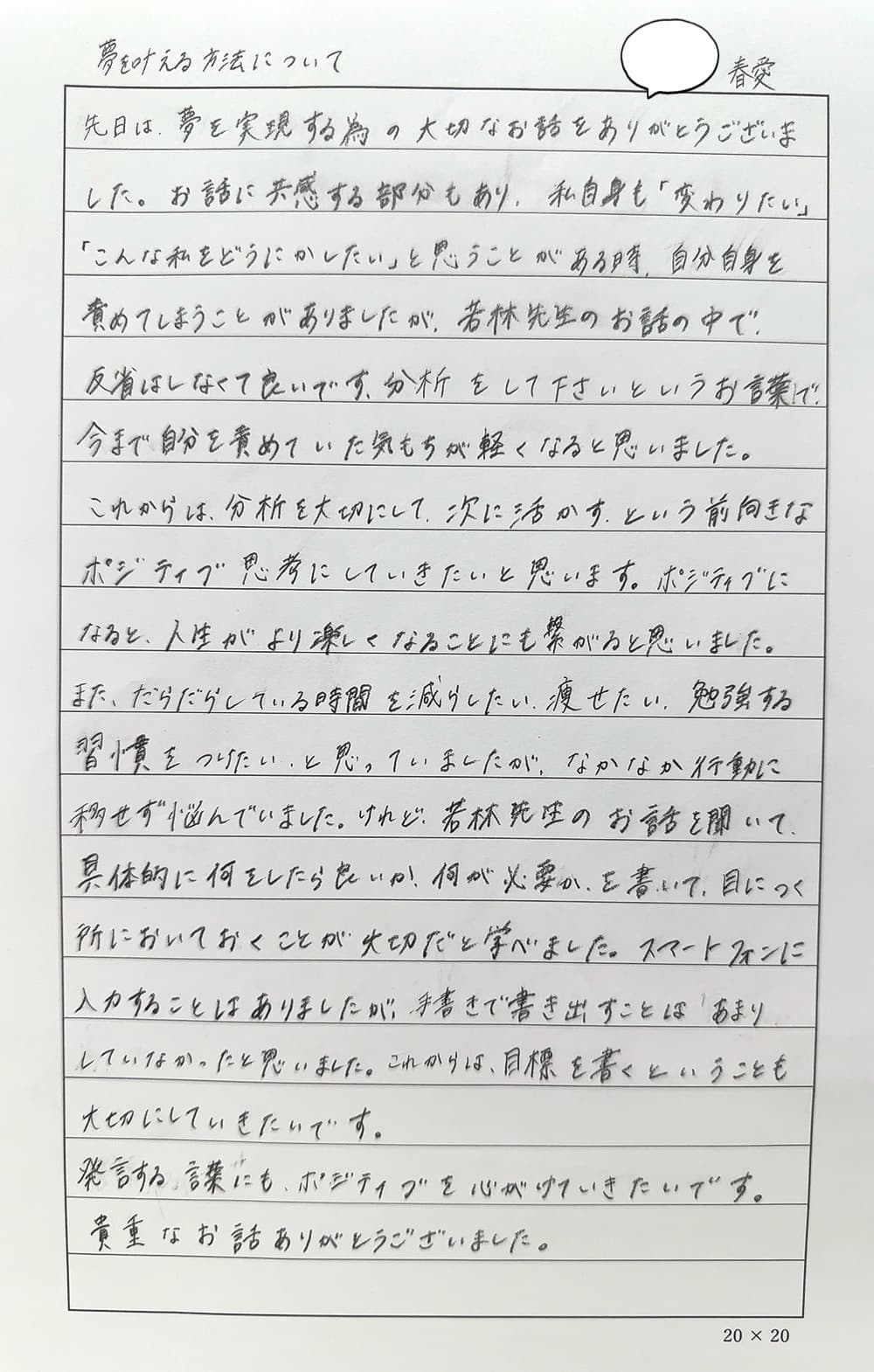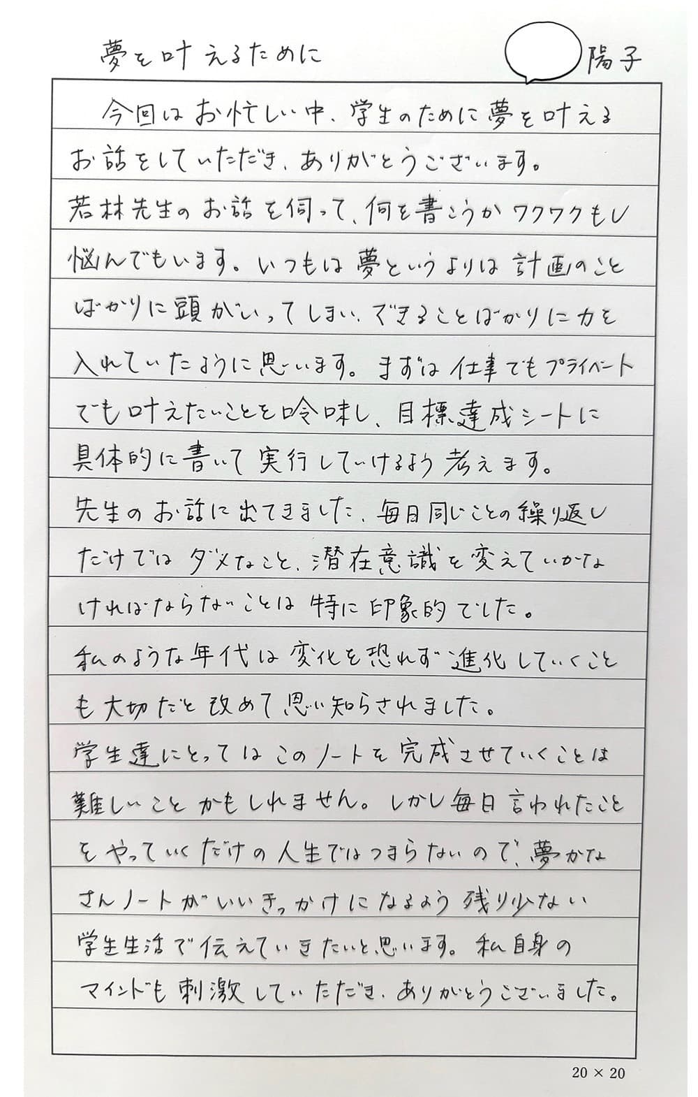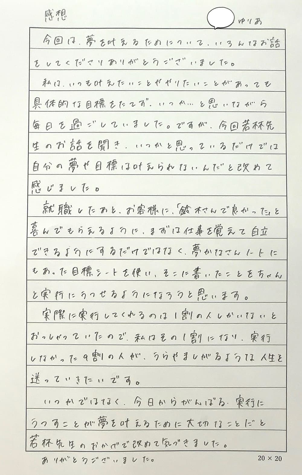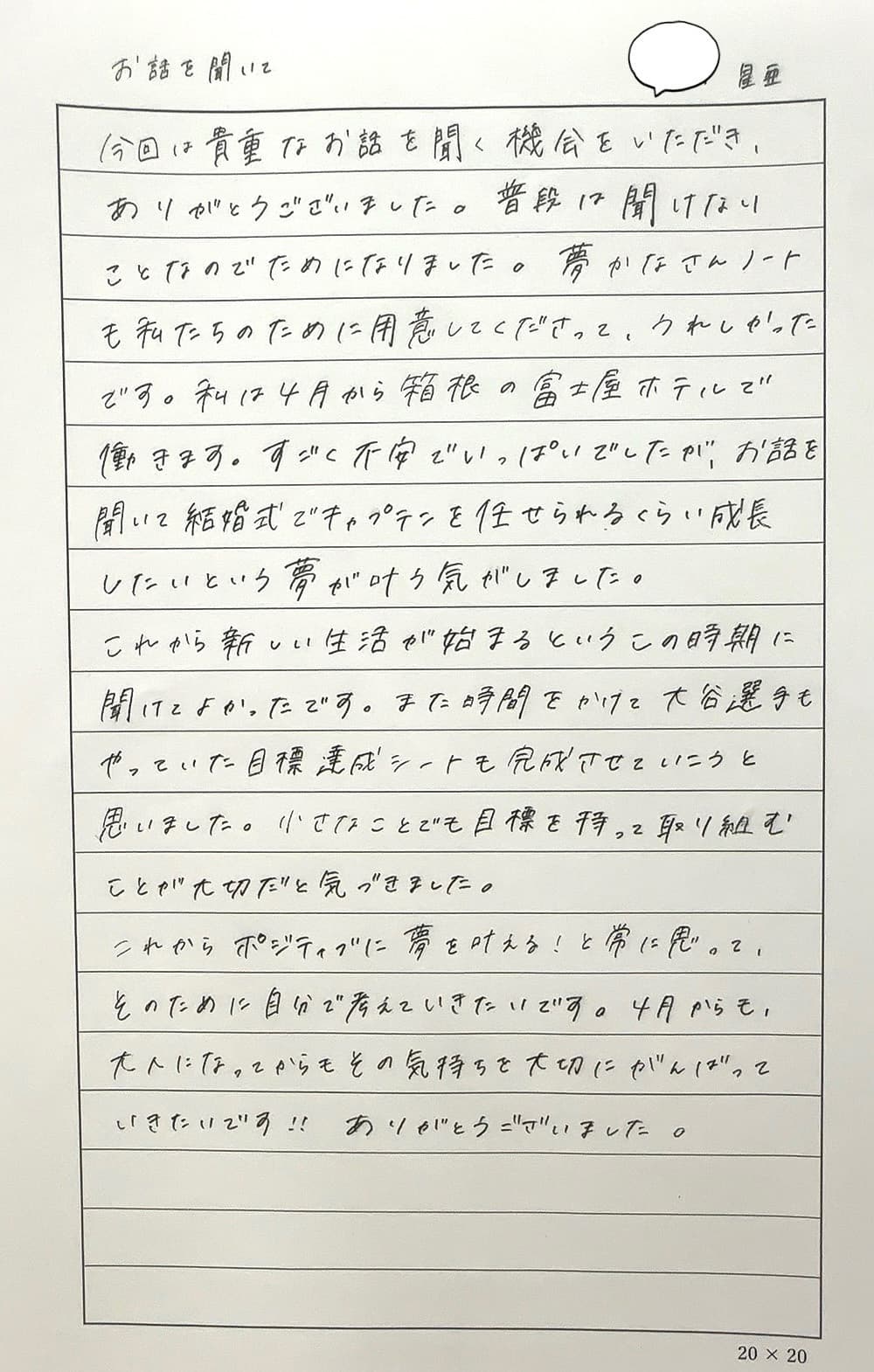 この春、社会人になる専門学校の学生に向けて、「夢実現のお話」と「夢かなさんノートの活用方法」の講演を2024年2月に開催しました。先生を含め、7名の方に感想をいただきました。